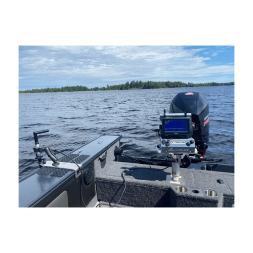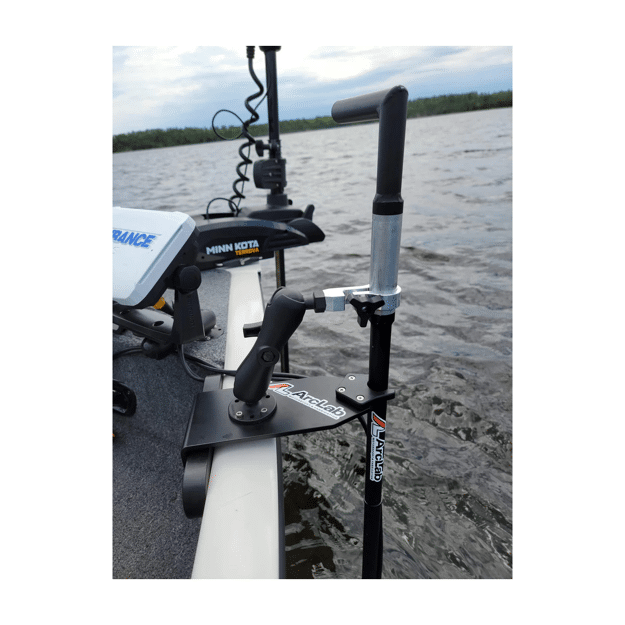 One of the most effective ways to mount ArcLab’s transducer pole. This thick aluminum 90 Degree bracket isolates the transducer pole at 2 points when used in conjunction with the PG-5000 kit. This greatly helps to resist deflection from drag. The HDPE holding clip provides the perfect amount of resistance to keep the pole and transducer from free spinning.