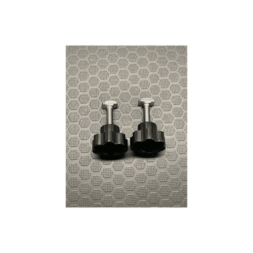 Hammer head T-bolts are stainless steel and are designed to insert anywhere along the track. The 1/4 turn hardware locks out so a the user can spin the hand knobs on.