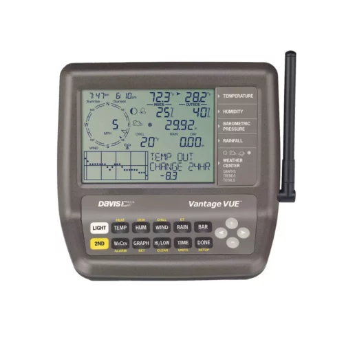 The Davis Vantage Vue weather station combines Davis’ legendary accuracy and rugged durability into a compact station that’s easy to set up and use. Vantage Vue includes a sleek but tough outdoor sensor array and a distinctive LCD console. Its unique Weather Center function provides additional information on each weather variable. In addition, Davis has made Vantage Vue radio-compatible with our flagship Vantage Pro2 professional stations so you can mix-and-match most components.