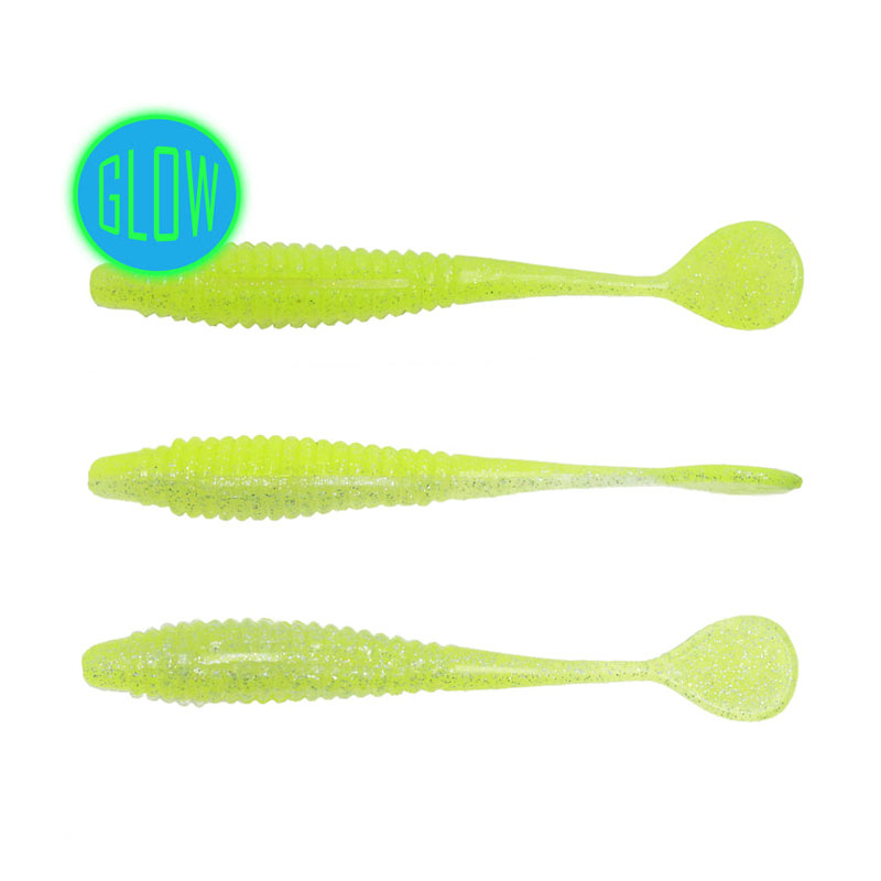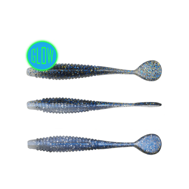 The Derby Slayer is a perfect mid-sized baitfish imitation for drop shotting, vertical hanging, or casting to cover vast swathes of water. The ribbed body gives the bait a lifelike flexibility, while offering a larger lateral line presence in the water. It is built uniformly round so that it can be rigged in several ways to give the tail different presentations. The unique flat paddle provides an unpredictable, wild flapping action when jigged aggressively, and conversely, a vulnerable shimmy even when attempting to hold this bait motionless.