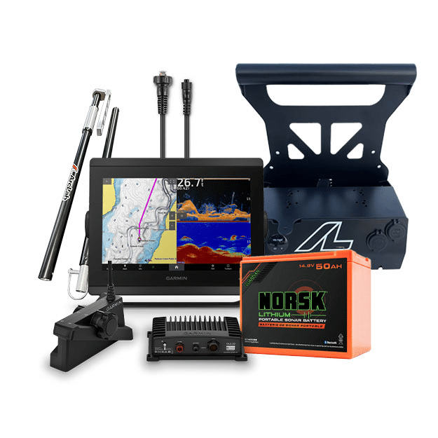 This custom bundle offers you the Garmin GPSMAP 8610xsv and Livescope XR Arclab Ice Fishing System for your Ultimate Ice Fishing Experience. You’ll love the Livescope XR System with GLS10 and LVS62 modules for the boat and ice kit, the Pro Series Transducer Pole and Shuttle, Norsk 14.8V 50AH battery and charger.