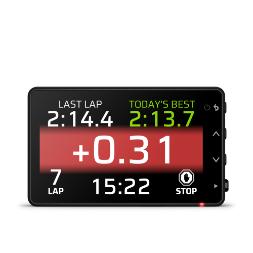 See your last lap time, best lap time, adaptive delta time on a red (behind) or green (ahead) gradient at a glance, alongside number of laps and total session time.