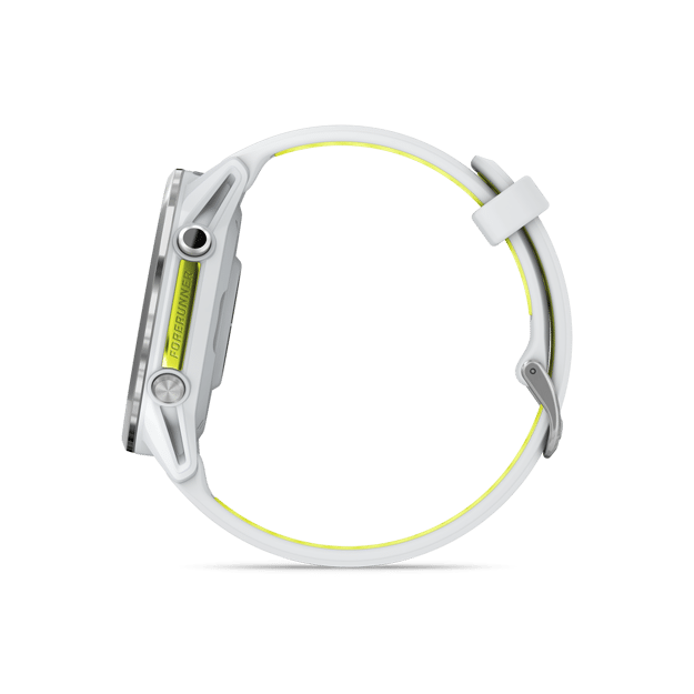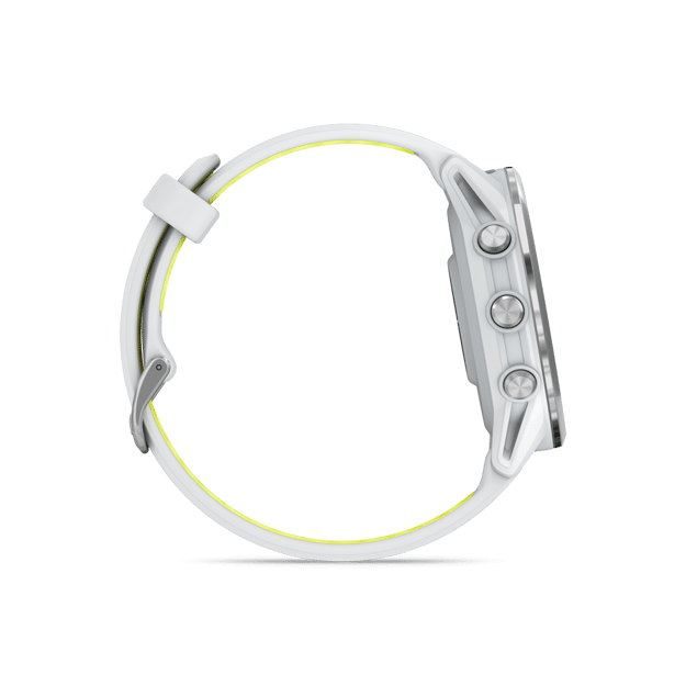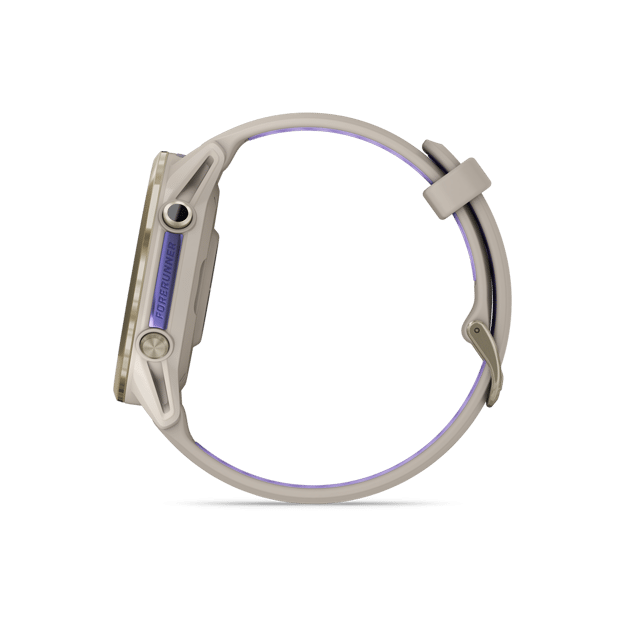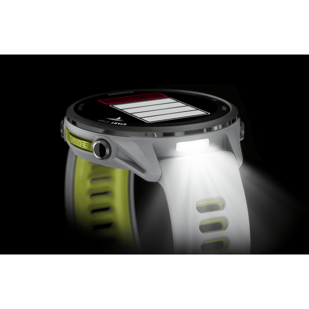 Garmin’s brightest AMOLED touchscreen display with button controls, a lightweight titanium bezel and sapphire lens, plus a built-in LED flashlight for greater awareness in the dark during early morning or late-night runs.