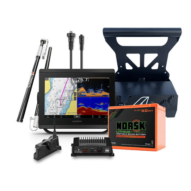 This custom bundle offers you the Garmin GPSMAP 8610xsv and Livescope+ Arclab Ice Fishing System for your Ultimate Ice Fishing Experience. You’ll love the Livescope Plus System GLS10 and LVS34 modules for the boat and ice kit, the Pro Series Transducer Pole and Shuttle, Norsk 14.8V 50AH battery and charger.