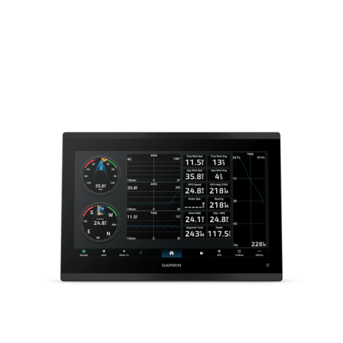 Get a connected boating experience by linking your compatible MFDs, cameras, sonars and more on the gigabyte-speed Garmin BlueNet™ network. The full suite of Garmin SailAssist™ features allows you to see wind speed, direction and other critical data at a glance. When your hands are full, use spoken commands to operate the chartplotter (compatible headset or smartwatch required; not included).