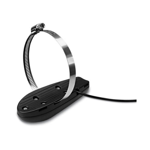 The 20 ft transducer cable with built-in fast response temperature sensor has a power rating of 500 W; a depth of 1,900 ft (traditional) and 750 ft (ClearVĂĽ); an operating frequency of 77/200 kHz (traditional) and 455 kHz (ClearVĂĽ); and a 0 to 70 transom angle.