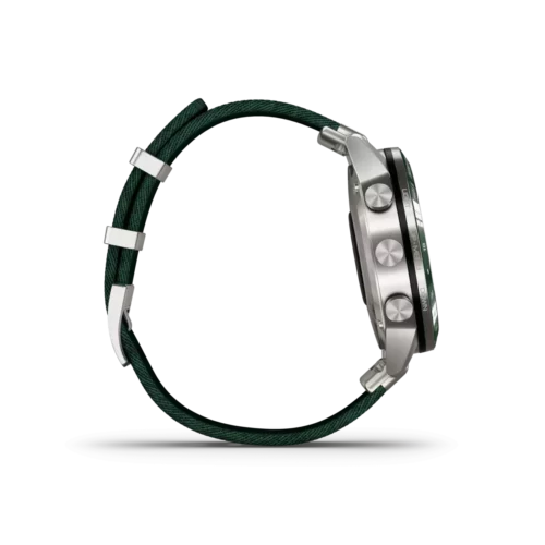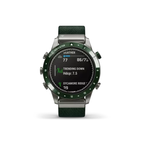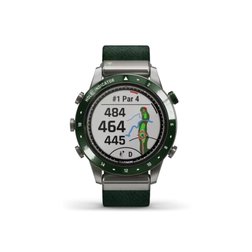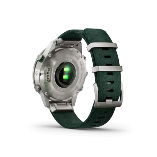 Premium design and materials made for performance; ceramic bezel with custom golf hole markings, tritone green jacquard-weave nylon strap made for comfort and functional flush-mounted hardware and keepers