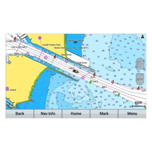 To aid in navigation, the shallow water shading feature highlights depths up to a user-defined level.