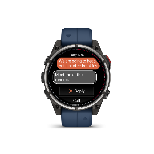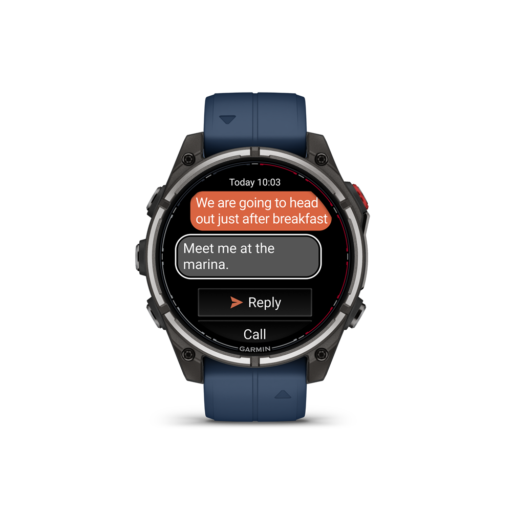 Through satellite or LTE connection, messages can be shared with other Garmin Messenger app users directly from your watch. quatix 8 Pro will automatically sync with the Messenger app contacts when your watch is paired with your smartphone.