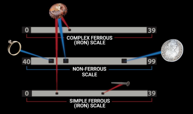 When operating in Multi-Frequency, the VX9’s Target ID system displays a non-ferrous scale and two ferrous scales to help identify unwanted iron trash. Targets are detected and analyzed using simultaneous multiple frequencies, as well as utilizing multiple dimensions of conductivity and ferrous (iron) content.