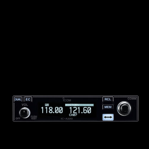 The IC-A220 has a bright organic light emitting diode (OLED) display with a wide 170-degree viewing angle. White characters on a black background give the viewer clear, easy to read operating information. The white key backlighting and white OLED display match a modern plane’s instrument panel. In addition, the auto dimmer function adjusts the display for optimum brightness for either day or night.