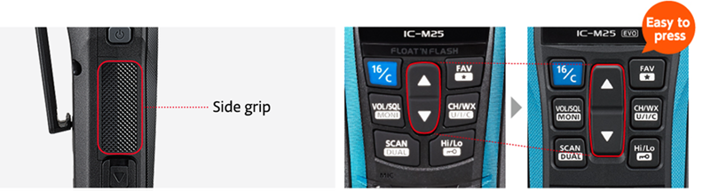 The IC-M25 EVO is built for practicality, featuring an improved side grip texture for a secure, anti-slip hold even with wet hands. Enlarged user-friendly buttons ensure easy operation for channel navigation.