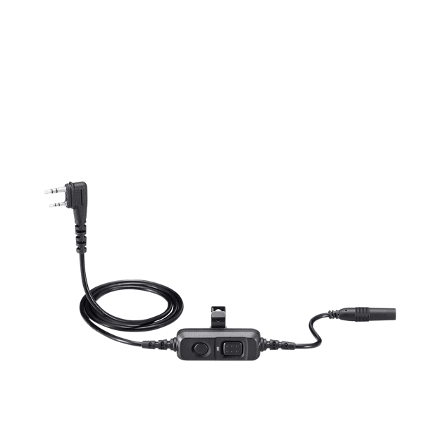 Headset adapter cable with push-to-talk (PTT) switch and 2-pin L type connector.