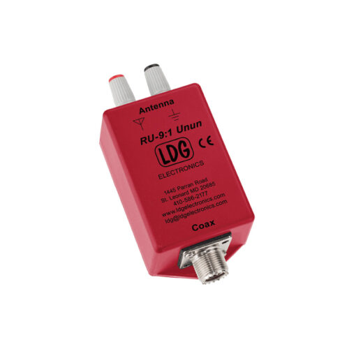 The RU-9:1 allows you to easily match an end-fed long wire antenna with your LDG Automatic Antenna Tuner. Connection is made by a 5-way, twist-on binding post; connect the red post to the antenna. A ground terminal connection is available for an optional counterpoise or radial system. The RU-9:1 is intended to match a long wire antenna of 30 – 135 feet, with or without a ground.