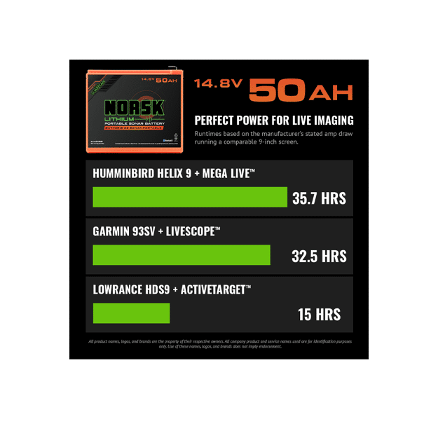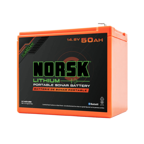 The Norsk Lithium 14.8V 50Ah Lithium-Ion Battery is the most powerful portable sonar battery in its class—purpose-built to deliver extended, uninterrupted runtime for high-demand forward-facing sonar systems. Designed for anglers who rely on advanced imaging technologies like Humminbird MEGA Live Imaging™, Garmin Livescope™, and Lowrance ActiveTarget™, this battery ensures your electronics stay powered longer, so you can focus on fishing, not power management.