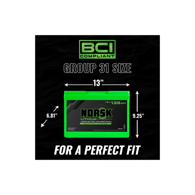 Norsk Lithium 16V Deep Cycle batteries are constructed in BCI-compliant cases, ensuring they fit in the same space as a Group 31 lead-acid or AGM battery. This eliminates the need for an oversized proprietary battery tray.