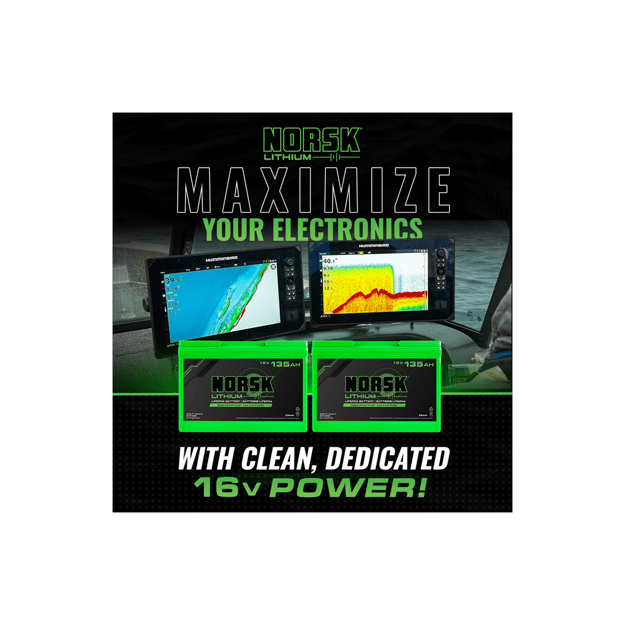 This battery features Deep Sleep™ functionality, Bluetooth monitoring via the Norsk Guardian® App, and a one-touch power management button. This is a single-battery solution that provides all-day runtimes for large sonar screens and forward-facing sonar.