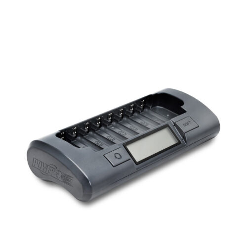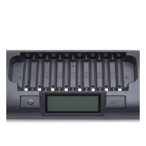 This charger has 8 independent charging circuits capable of charging 1-8 AA/AAA batteries in any combination. The charger has a large LCD screen that shows the charging status of each battery.