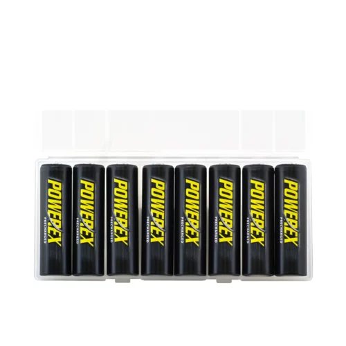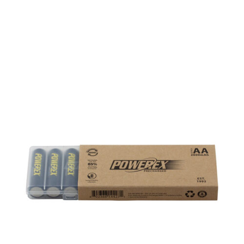 The Powerex Precharged MH-8AAP-BH Rechargeable AA NiMH Batteries (1.2V, 2600mAh) – 8-Pack is a package of 8 AA nickel-metal hydride (NiMH) batteries. They have a voltage of 1.2V and a capacity of 2600mAh, with a minimum capacity of 2450mAh. The batteries are capable of being stored for an extended period of time and still retaining a full or nearly full charge. After a year, for instance, they will retain up to 85% of their capacity. The batteries come pre-charged and can be recharged up to 1000 times. The purchase of NiMH batteries like these saves you money, since you won’t need to buy endless supplies of non-rechargeable alkaline batteries. Made in Taiwan.