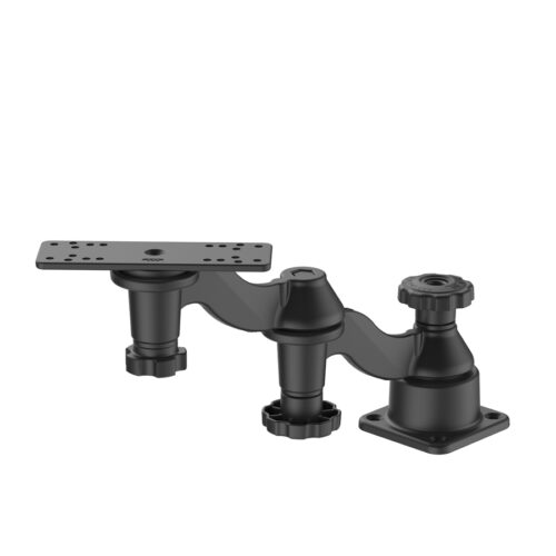 The RAM double swing arm mount includes two 6″ long BENT swing arms mounted on a horizontal surface mounting base. At the device mounting end of the mount is a rectangular 6.25 x 2″ top base. The pivoting points of the mount allow a complete 360 degree rotation.