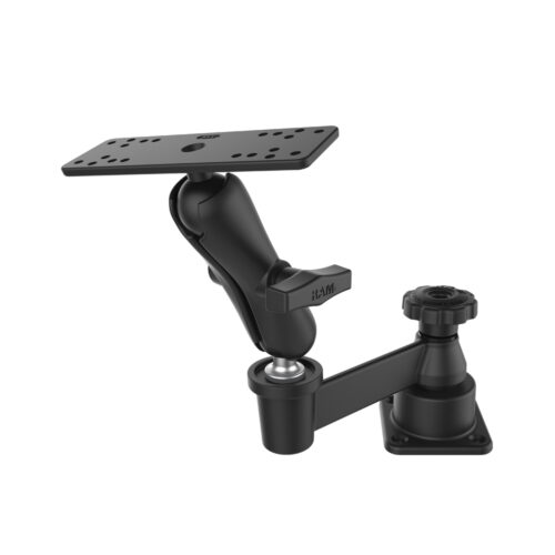The RAM double swing and socket arm mount includes a 6″ STRAIGHT swing arm mounted on a horizontal surface mounting base. At the end of the mount is a rectangular 6.25″ x 2″ top base. The bolt pivoting point of the mount allows a 360 degree rotation.