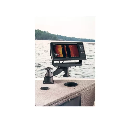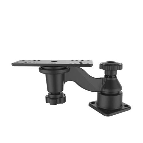 The RAM single swing arm mount consists of a 6″ long BENT swing arm mounted on a horizontal surface mounting base. At the device mounting end of the mount is a rectangular 6.25″ x 2″ plate. There are two (2) pivoting points on the mount. One at the swing arm and base and one at the center of the rectangular plate and the end of the swing arm. Each pivoting point allows a complete 360 degree rotation.