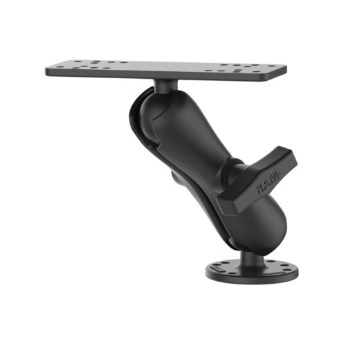 The RAM-111U consists of a 2.5″ diameter round base that contains the universal AMPs hole pattern, STANDARD LENGTH double socket arm and 6.25″ x 2″ rectangle base. The rectangle base contains different combinations of pre-drilled holes which will match up to many electronic devices and mounts, including Marine GPS, CB Radios, Ham Radios, Gimbal Brackets and more.