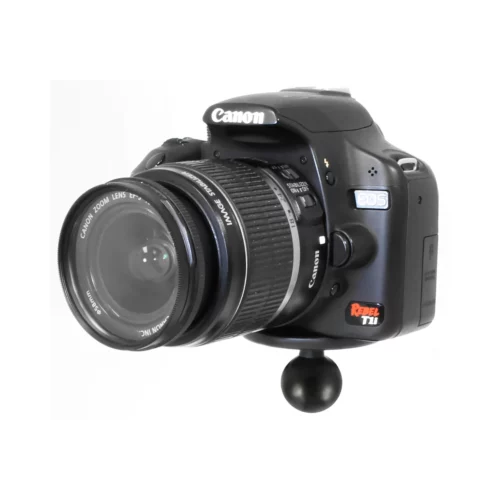The RAM-B-202AU, universal camera and camcorder base, consists of a 1″ diameter rubber ball, connected to a 2.5″ diameter round plate with 1/4″-20 camera thread. The round plate provides extra support and stability for cameras that rest on top of it. The male 1/4″-20 threaded steel stud will connect to any standard female thread found on camcorders and digital cameras.