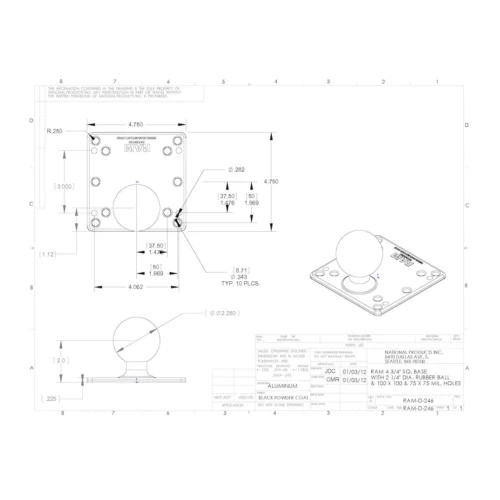 The RAM-D-246U consists of a 2.25″ rubber ball, connected to a 4.75″ square plate with 4x100mm holes and 4x75mm holes in each corner.