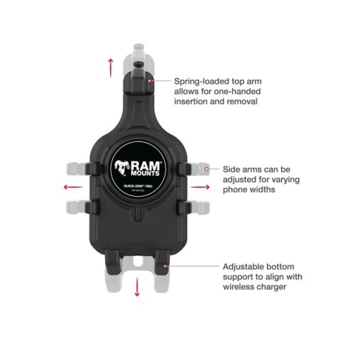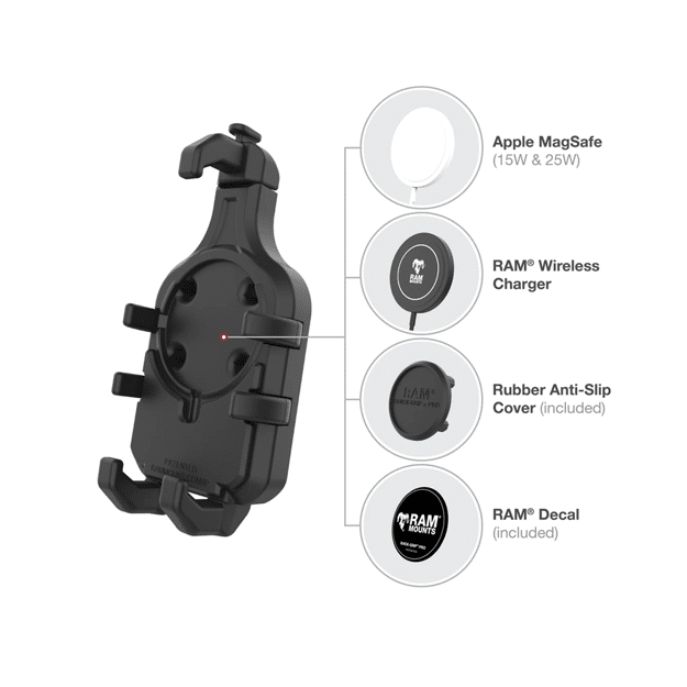 The RAM Quick-Grip Pro Phone Holder (RAM-HOL-PD5U) is the next evolution of the RAM Quick-Grip series. Re-designed with a new, sleek look and integrated rubber side arms to provide a secure, no-slip hold on your phone. This phone holder features an integrated cavity for an Apple MagSafe puck, allowing you to turn the phone holder into a wireless charging solution. Not interested in charging? No problem! The included anti-slip cover ensures a flush fit when the Apple MagSafe puck is not installed.