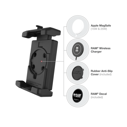 The RAM Quick-Grip Pro XL Phone Holder (RAM-HOL-PD7U) is the next evolution of the RAM® Quick-Grip series, re-designed to be the most rugged universal phone holder that fits a wide range of phones and handheld devices. This phone holder features an integrated cavity for an Apple MagSafe puck, allowing you to turn the phone holder into a wireless charging solution. Not interested in charging? No problem! The included anti-slip cover ensures a flush fit when the Apple MagSafe puck is not installed.