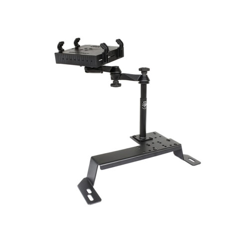 This No-Drill™ Laptop Stand System installs quickly and easily into the specified vehicles using the existing hardware of the passenger side seat rails. This configuration provides a telescoping feature that ranges from 12 to 18 inches. Dual swing arms provide articulation and 12 inches of reach for passenger and driver access to the mounted device. Patented rubber ball and socket joint provides additional adjustment as well as shock and vibration isolation. The RAM Tough-Tray™ is spring loaded to accommodate 10″ to 16″ wide laptops & (17″ wide screens). The tray features four adjustable retaining arms with rubber grip feature. These arms can be moved both vertically and horizontally. This allows for a custom fit for varying thicknesses of laptops and the freedom of not blocking ports or drives. A screen support and USB light are also available to accessorize the tray. Hole patterns on perimeter of tray facilitate the mounting of additional RAM systems to support GPS or other electronics.