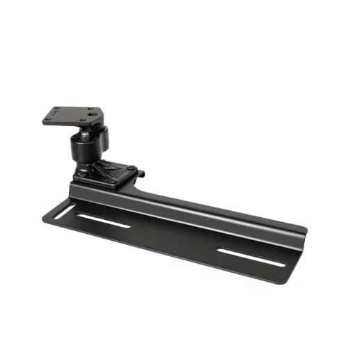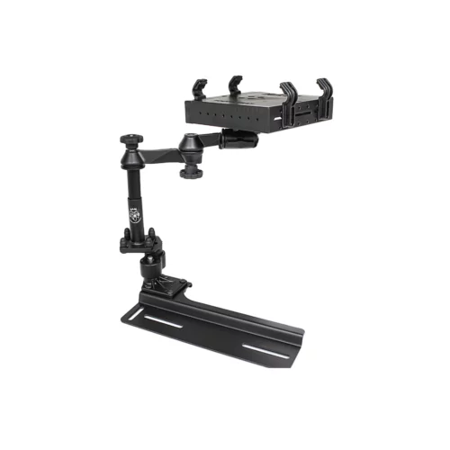 This No-Drill™ Laptop Stand System installs quickly and easily into the specified vehicles using the existing hardware of the passenger side seat rails. This configuration provides a telescoping feature that ranges from 12 to 18 inches. Dual swing arms provide articulation and 12 inches of reach for passenger and driver access to the mounted device. Patented rubber ball and socket joint provides additional adjustment as well as shock and vibration isolation. The RAM Tough-Tray™ is spring loaded to accommodate 10″ to 16″ wide laptops & (17″ wide screens). The tray features four adjustable retaining arms with rubber grip feature. These arms can be moved both vertically and horizontally. This allows for a custom fit for varying thicknesses of laptops and the freedom of not blocking ports or drives. A screen support and USB light are also available to accessorize the tray. Hole patterns on perimeter of tray facilitate the mounting of additional RAM systems to support GPS or other electronics.