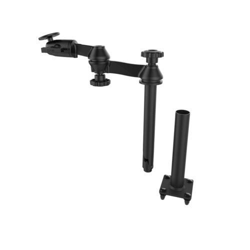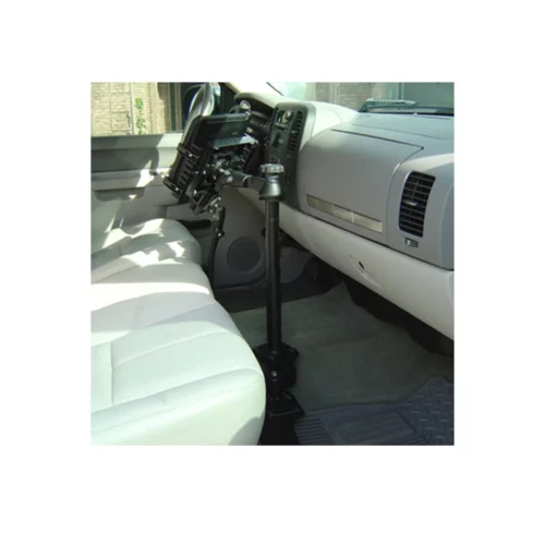This No-Drill™ Laptop Stand System installs quickly and easily into the specified vehicles using the existing hardware of the passenger side seat rails. This configuration provides a telescoping feature that ranges from 12 to 18 inches. Dual swing arms provide articulation and 12 inches of reach for passenger and driver access to the mounted device. Patented rubber ball and socket joint provides additional adjustment as well as shock and vibration isolation. The RAM Tough-Tray™ is spring loaded to accommodate 10″ to 16″ wide laptops & (17″ wide screens). The tray features four adjustable retaining arms with rubber grip feature. These arms can be moved both vertically and horizontally. This allows for a custom fit for varying thicknesses of laptops and the freedom of not blocking ports or drives. A screen support and USB light are also available to accessorize the tray. Hole patterns on perimeter of tray facilitate the mounting of additional RAM systems to support GPS or other electronics.
