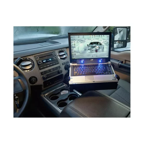 This No-Drill™ Laptop Stand System installs quickly and easily into the specified vehicles using the existing hardware of the passenger side seat rails. This configuration provides a telescoping feature that ranges from 12 to 18 inches. Dual swing arms provide articulation and 12 inches of reach for passenger and driver access to the mounted device. Patented rubber ball and socket joint provides additional adjustment as well as shock and vibration isolation. The RAM Tough-Tray™ is spring loaded to accommodate 10″ to 16″ wide laptops & (17″ wide screens). The tray features four adjustable retaining arms with rubber grip feature. These arms can be moved both vertically and horizontally. This allows for a custom fit for varying thicknesses of laptops and the freedom of not blocking ports or drives. A screen support and USB light are also available to accessorize the tray. Hole patterns on perimeter of tray facilitate the mounting of additional RAM systems to support GPS or other electronics.