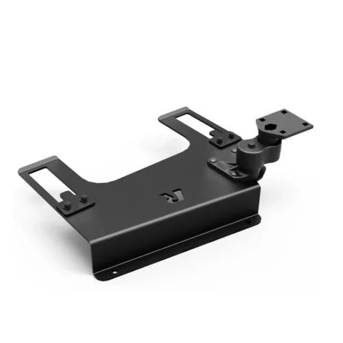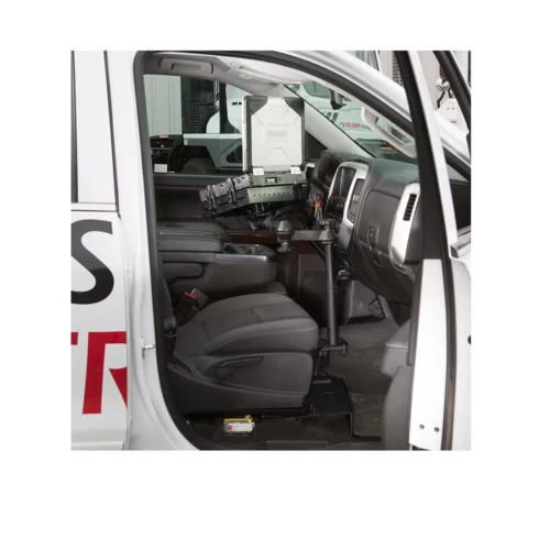 This No-Drill™ Laptop Stand System installs quickly and easily into the specified vehicles using the existing hardware of the passenger side seat rails. This configuration provides a telescoping feature that ranges from 12 to 18 inches. Dual swing arms provide articulation and 12 inches of reach for passenger and driver access to the mounted device. Patented rubber ball and socket joint provides additional adjustment as well as shock and vibration isolation. The RAM Tough-Tray™ is spring loaded to accommodate 10″ to 16″ wide laptops & (17″ wide screens). The tray features four adjustable retaining arms with rubber grip feature. These arms can be moved both vertically and horizontally. This allows for a custom fit for varying thicknesses of laptops and the freedom of not blocking ports or drives. A screen support and USB light are also available to accessorize the tray. Hole patterns on perimeter of tray facilitate the mounting of additional RAM systems to support GPS or other electronics.